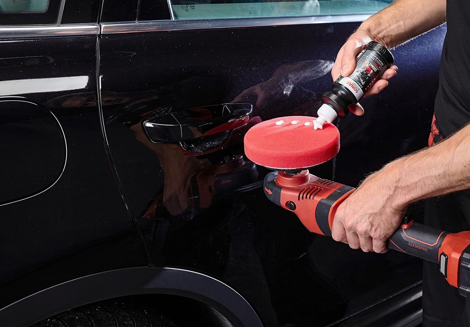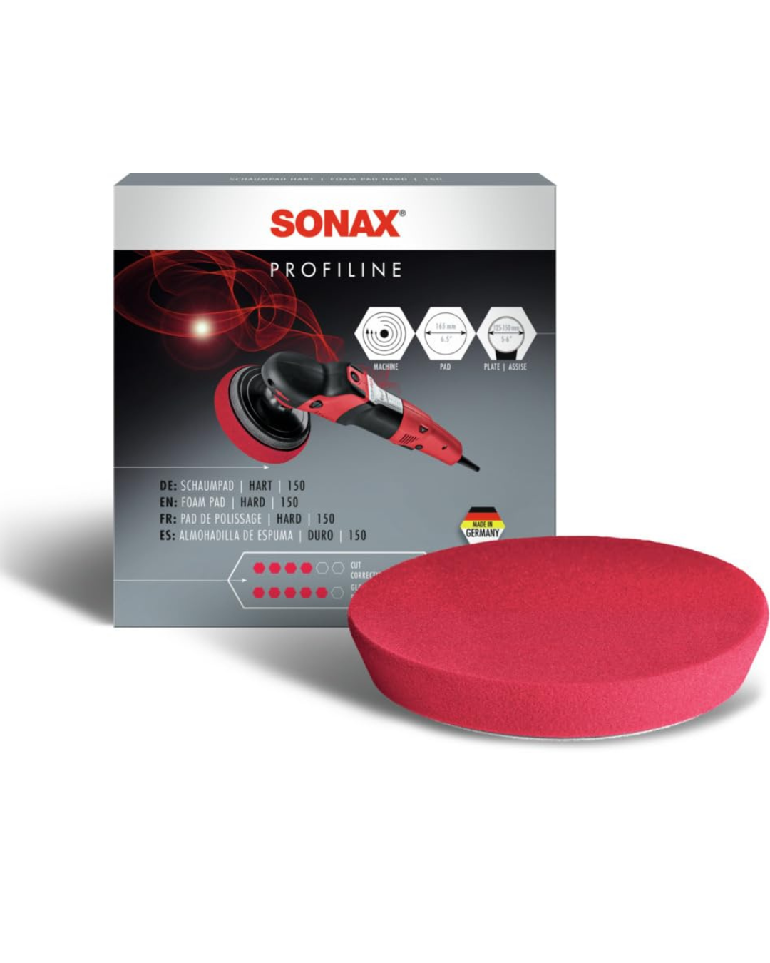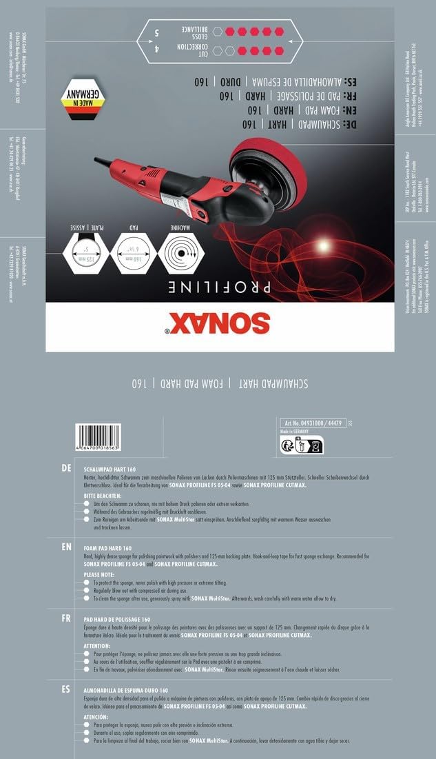 SONAX Orbital Polishing Pad Hard 150 ARTICLE NUMBER: 04924410 Hard, high-density, open-pored sponge for mechanical polishing of paintwork with orbital polishers. Long service life and temperature resistance thanks to good ventilation and special cooling of the center. Hook-and-loop fasteners allow for quick disc changes. The beveled sponge edge ensures excellent handling. For backing pads with a diameter of 150 mm. Ideal for use with SONAX PROFILINE ExCut 05-05. Place the polishing pad centrally on the backing plate. Do not overheat the polishing area. To protect the sponge, never polish with high pressure or at an extreme angle. Regularly blow out the pad with compressed air during use. Clean polishing pads regularly and never use different polishing compounds on the same pad.