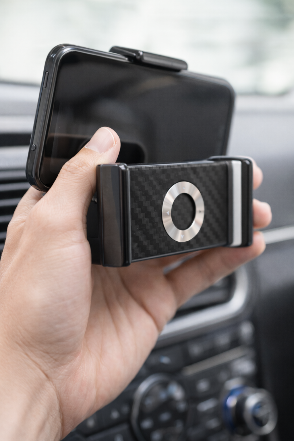 It attaches securely to the rearview mirror, keeping the dashboard clutter-free.