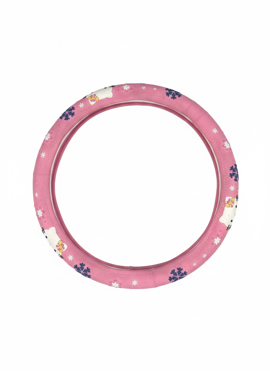 A cute Hello Kitty pink steering wheel cover made from soft, comfortable material.