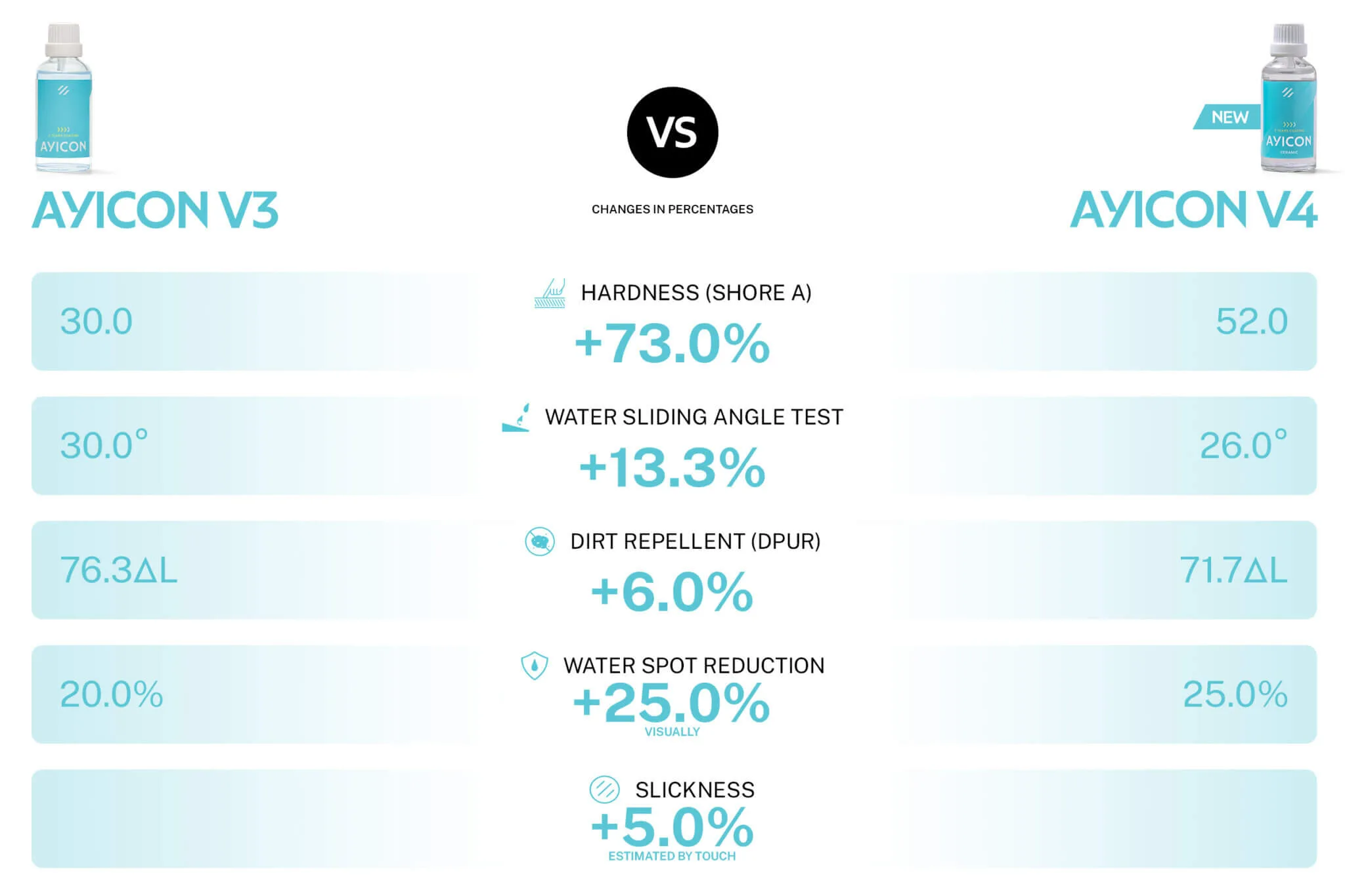 Introducing Ayicon V4: Our 2024 upgrade to the V3 formula offers a host of enhancements, including a 73% increase in coating hardness and a 13.3% improvement in the water sliding angle. These advancements result in a more durable coating with superior self-cleaning properties, allowing water beads to sheet off more quickly.