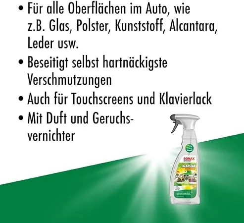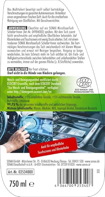 CleanStar Ecocert is a gentle cleaner for all surfaces inside the car — such as glass, upholstery, plastic, Alcantara, leather, and more. It gently removes even stubborn dirt and leaves behind a pleasant fresh fragrance. It is also ideal for streak-free cleaning of glass surfaces, sensitive touchscreen displays, and piano lacquer. Contains an odor eliminator and is made with 99.75% natural ingredients.